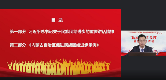 本次培訓(xùn)以良法善治,凝心聚力,鑄牢中華民族共同體意識為主題,中國政法大學(xué)劉東剛博士圍繞習(xí)近平總書記關(guān)于民族團結(jié)進(jìn)步的重要講話指示精神、《中國共產(chǎn)黨統(tǒng)一戰(zhàn)線工作條例》《內(nèi)蒙古自治區(qū)促進(jìn)民族團結(jié)進(jìn)步條例》《中華人民共和國國家通用語言文字法》《內(nèi)蒙古自治區(qū)實施〈中華人民共和國國家通用語言文字法〉辦法》《民族區(qū)域自治法》《城市民族工作條例》的重點亮點內(nèi)容進(jìn)行了解讀。
