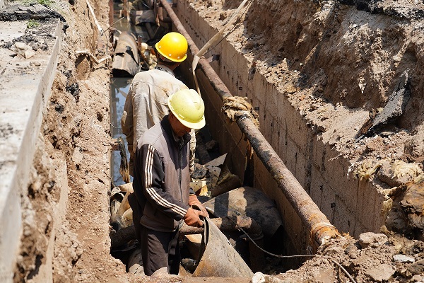 開天花園小區(qū)施工直播結(jié)束后,我們直播組直奔如意小區(qū)供熱二次管網(wǎng)改造的施工現(xiàn)場。循著一陣陣的臭味,我們來到了如意小區(qū)的A區(qū)一幼兒園后面,映入眼簾的是正在抽排污水的地溝,地溝中的供熱管線距污水水面非常近,污水在炎熱天氣的發(fā)酵下,臭氣熏天。工人們正在深溝里進(jìn)行排污及淤泥清理工作,每一個(gè)動(dòng)作都顯得格外艱難,衣服幾乎和污水一個(gè)顏色。