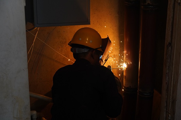 上午9:30時(shí),直播組來到開天花園北區(qū)1號(hào)樓前,小區(qū)供熱主線的管溝內(nèi),一工人師傅穿著長褂,帶著手套在狹小的空間內(nèi)正嫻熟地進(jìn)行焊接,飛濺的火花下面,看不清楚他的臉,待焊接完一段后,他取下電焊面罩,露出一張黑紅黑紅的臉,汗水順著額頭直瀉而下,汗珠吧嗒吧嗒流在眼里、滴到了地上,不時(shí)用衣袖擦眼睛。他告訴筆者,地面溫度是36°,他焊接的周邊溫度要達(dá)到50多度。面對高溫的"烤"驗(yàn),他全然不顧,用他的話說:這是他們的工作常態(tài),早已習(xí)慣。